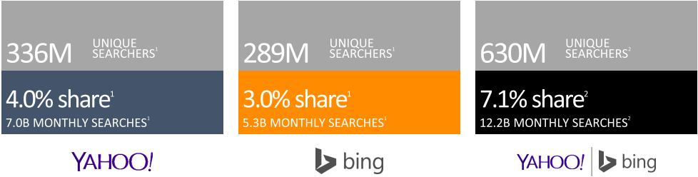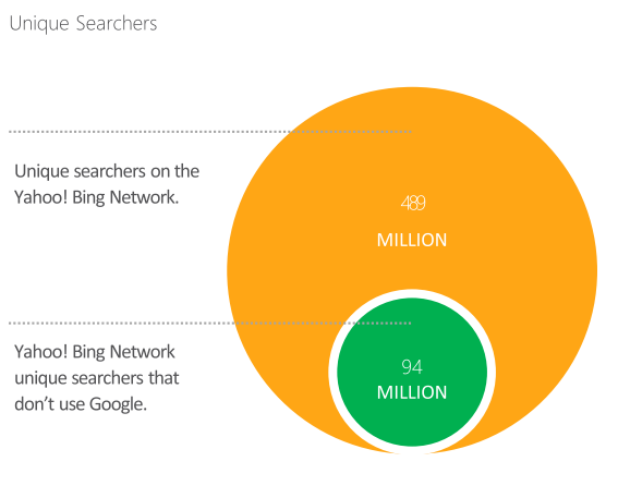 2)必應(yīng)+雅虎的用戶中有19.3% (9400萬(wàn))的搜索用戶不使用Google,這些用戶只能通過(guò)必應(yīng)+雅虎才能觸達(dá)。在美國(guó),微軟和雅虎月搜索請(qǐng)求達(dá)60億次,占市場(chǎng)近1/3。月覆蓋用戶達(dá)到近1.6億,達(dá)90%。 其中, 4730萬(wàn)用戶只使用必應(yīng)和雅虎搜索,而不使用Google。