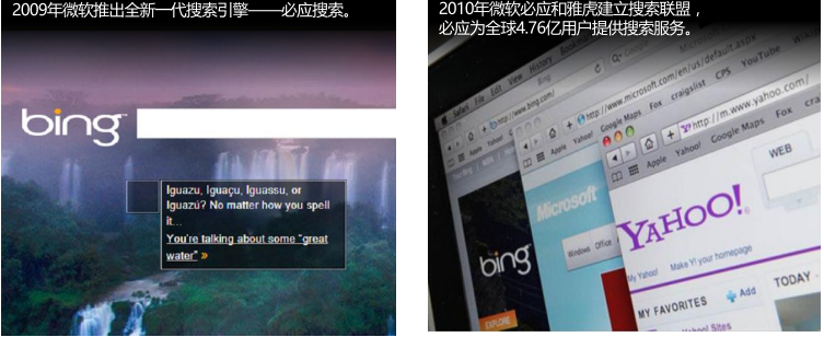 1)2010年與雅虎合作,結(jié)成搜索聯(lián)盟,除日本之外所有國(guó)家yahoo搜索結(jié)果都展示bing的廣告
